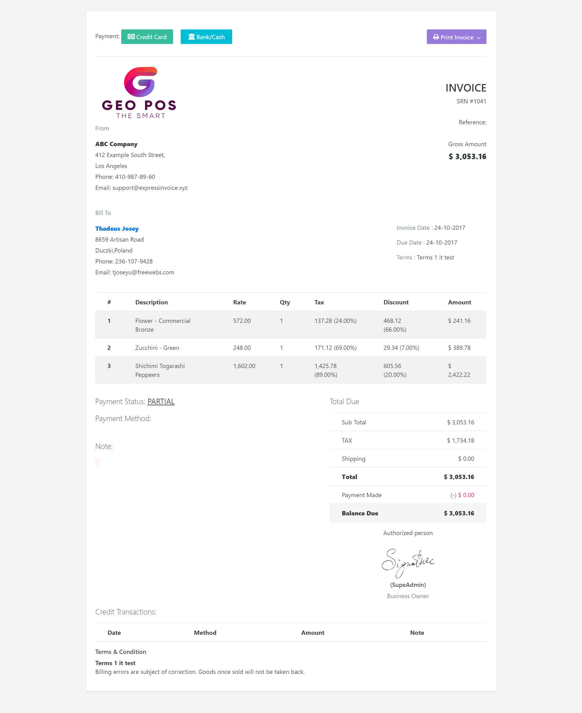 After creation of invoice you can view the invoice. Manage invoice actions like edit, cancel,email, print.